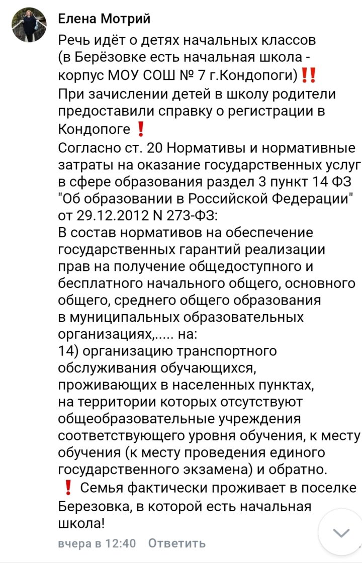 — Ранее наши дети добирались до школы своими силами. Вопрос наш решился, всем детям предоставили автобус. Но оказалось, что мои дети, также проживающие в поселке Березовка, не были включены в список на этот автобус и отдел образования Кондопоги пишет мне в паблике, что они не обязаны возить моих детей, так как они посещают начальное звено школы №8. Но при этом начальное звено из других школ почему-то ездит на этом автобусе, детектор школы №8 сегодня утром озвучила мне, что ей нет дела до моих детей и она по закону не включила их в список, а, мол, другие школы нарушают закон, — рассказывает Елена.