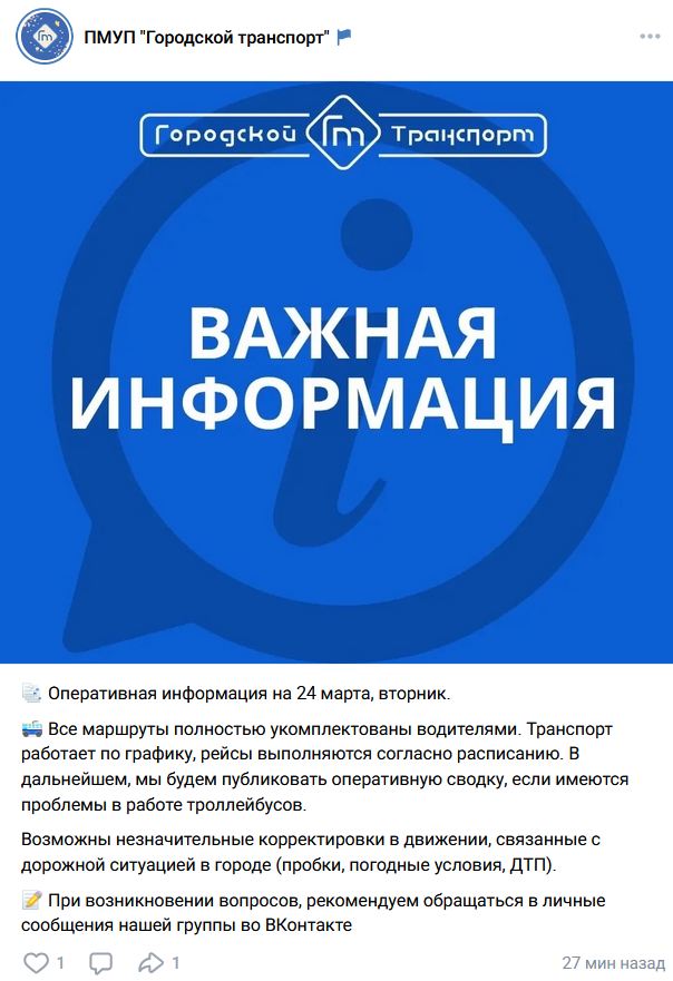 Сегодня, 24 марта, в предприятии сообщили, что все маршруты полностью укомплектованы водителями, транспорт работает по графику, а рейсы выполняются согласно расписанию. В паблике обещают продолжить публиковать оперативную сводку, если будут проблемы в работе троллейбусов, а также отметили, что возможны незначительные корректировки в движении из-за пробок, погоды и ДТП.